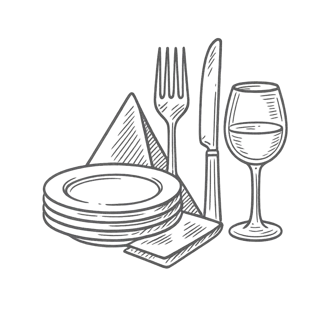 Assiettes, fourchettes, couteaux, verres (eau/vin/flûte) et serviettes. Retour non rincé accepté — nous gérons le lavage.